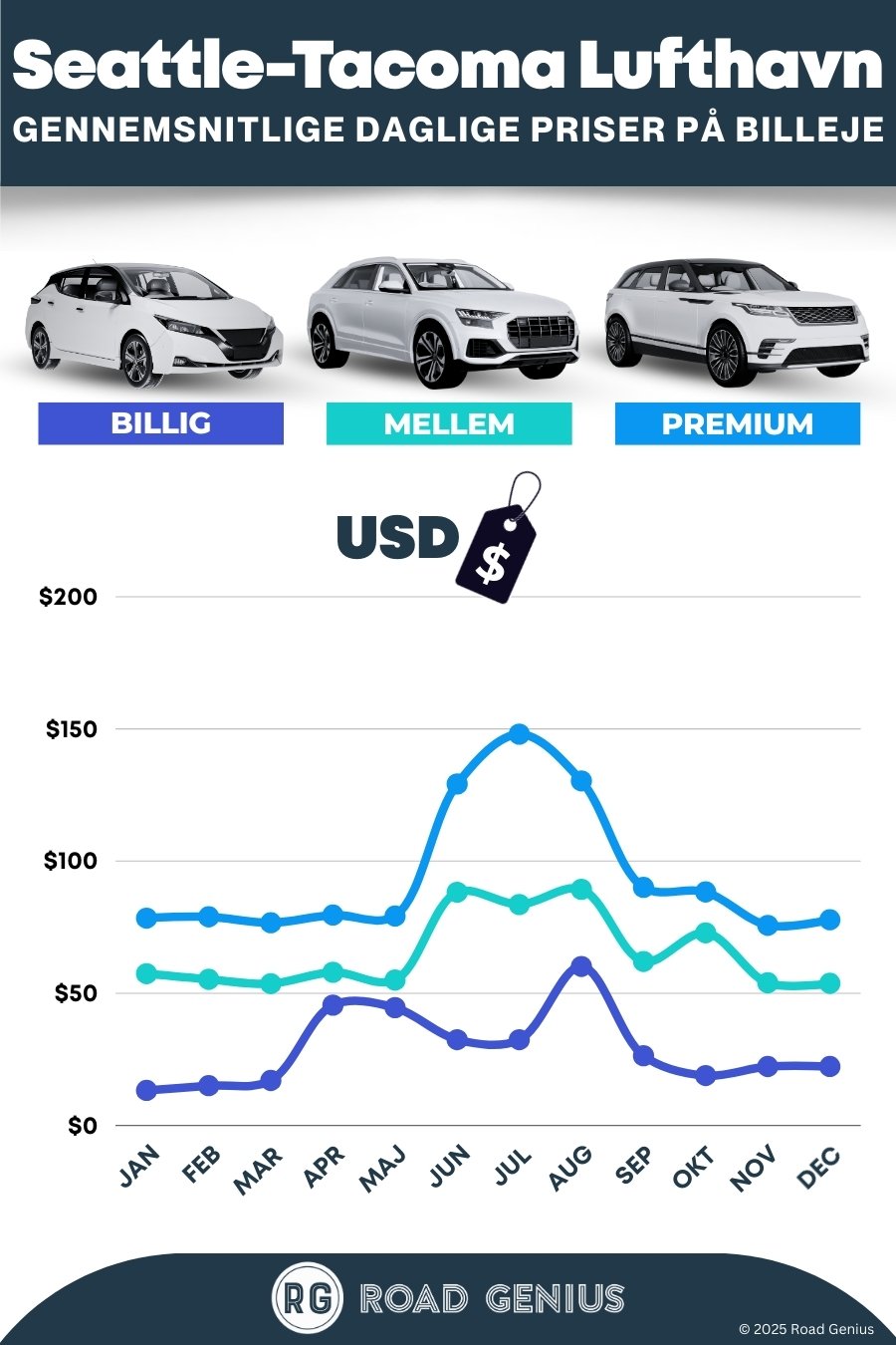 Book på det rigtige tidspunkt. Sommer og ferieperioder er højsæson i Seattle. Book 2–4 uger i forvejen for bedre priser end ved leje på stedet. Januar–februar (uden for skisæsonen) er ofte de billigste måneder. Hold øje med priserne, og ombook gerne ved prisfald.