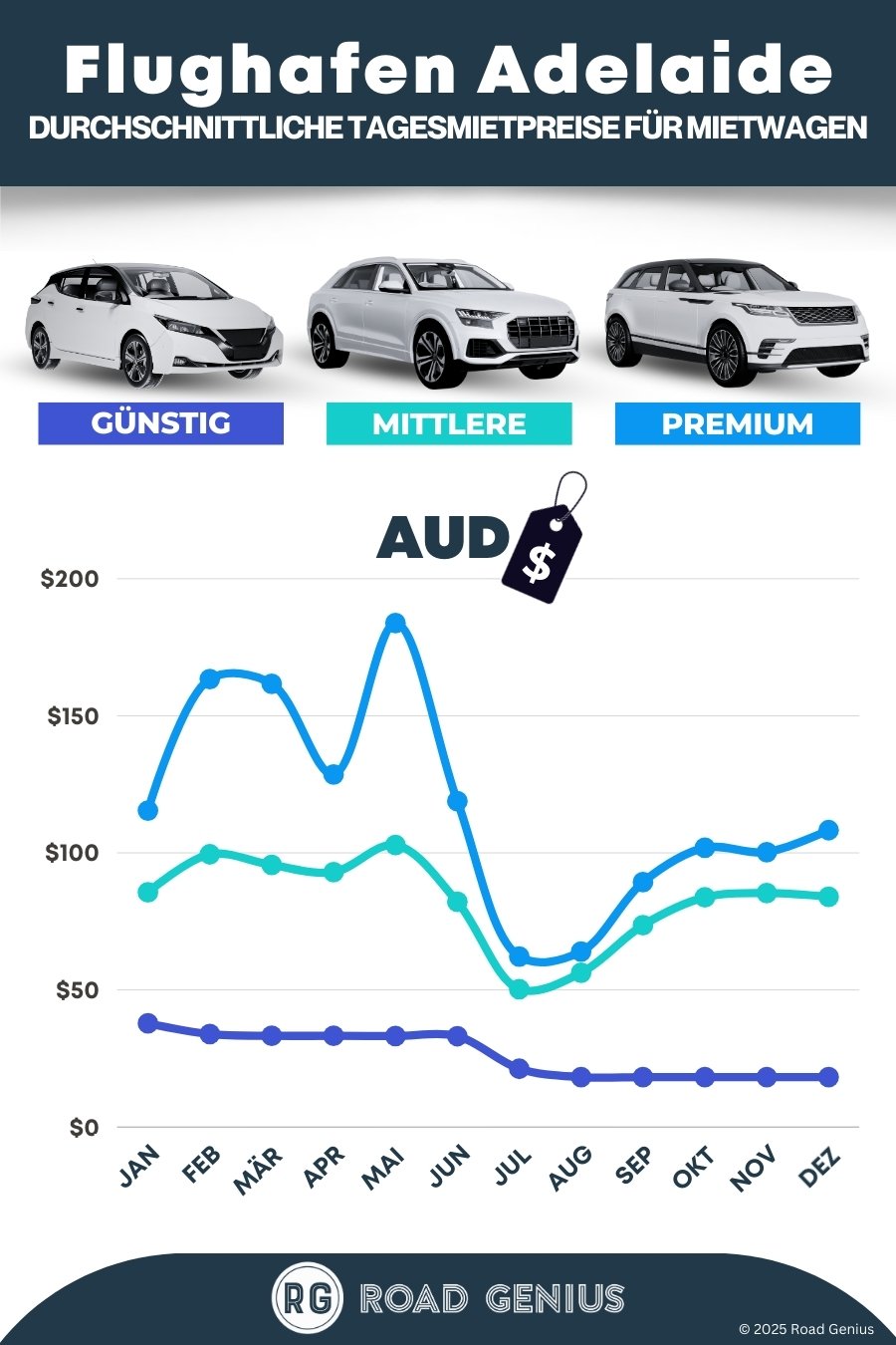 Im Durchschnitt kosten Mietwagen am Flughafen Adelaide (ADL) etwa AUD 100 pro Tag, wobei die günstigsten Angebote bereits ab AUD 18 pro Tag verfügbar sind.