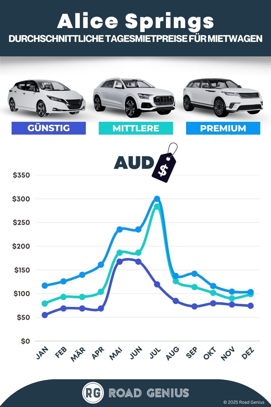 Im Durchschnitt kosten Mietwagen in Alice Springs etwa AUD 116 pro Tag, wobei die günstigsten Angebote bereits ab AUD 69 pro Tag erhältlich sind.