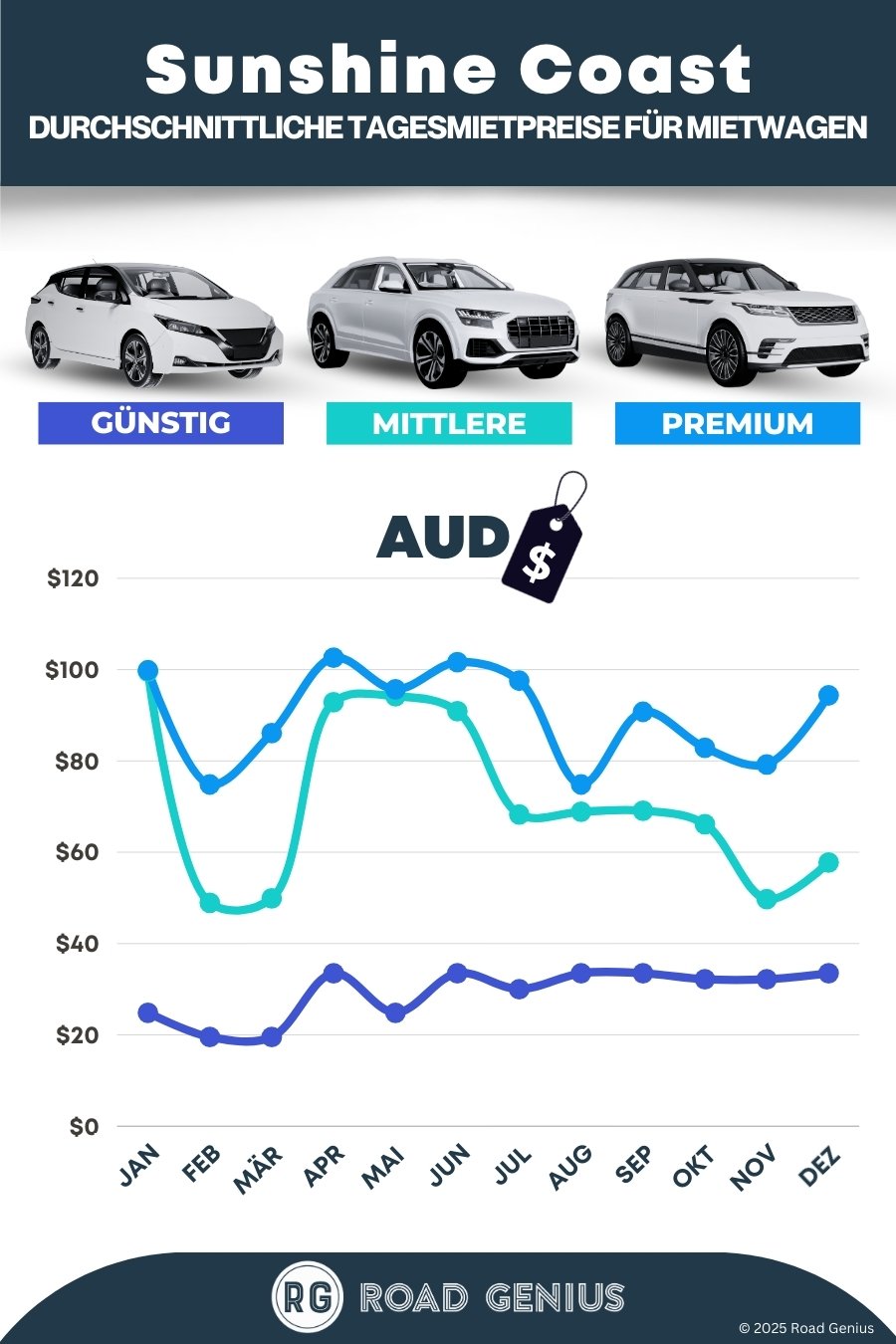 Im Durchschnitt kosten Mietwagen an der Sunshine Coast etwa AUD 79 pro Tag, wobei die günstigsten Angebote bereits ab AUD 20 pro Tag erhältlich sind.