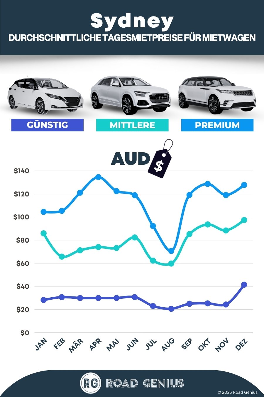 Im Durchschnitt kosten Mietwagen in Sydney etwa AUD 97 pro Tag, wobei die günstigsten Angebote bereits ab AUD 21 pro Tag verfügbar sind.