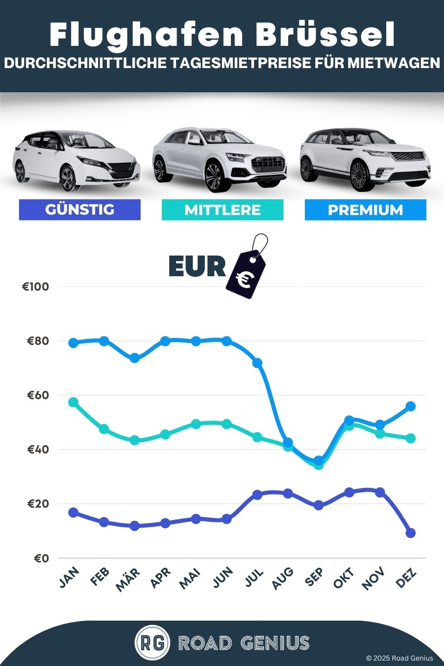 Im Durchschnitt kosten Mietwagen am Flughafen Brüssel etwa 43 € pro Tag, wobei die günstigsten Angebote bereits ab 9 € pro Tag verfügbar sind.