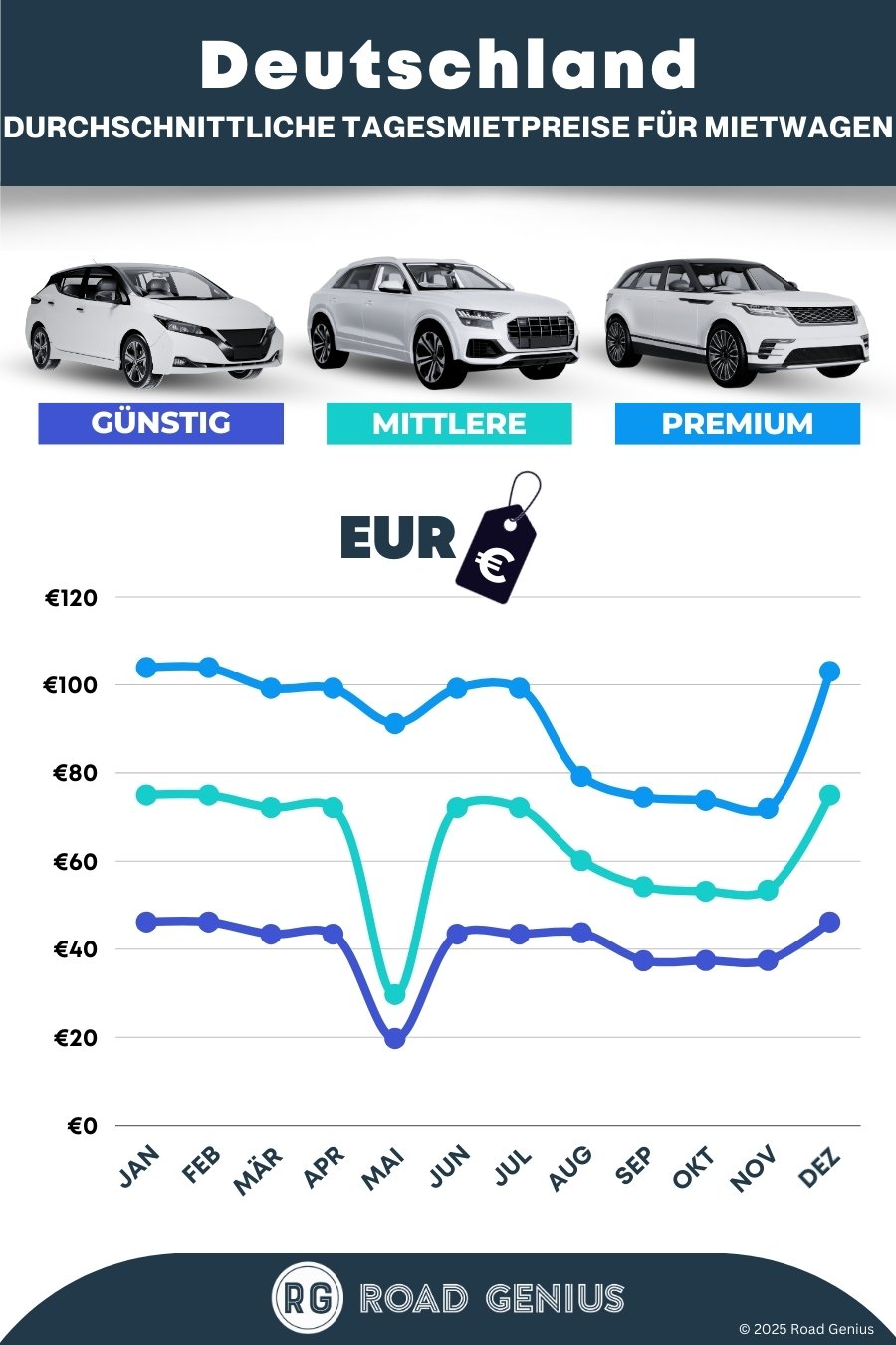 Finden Sie mit Road Genius günstige Mietwagen in Deutschland. Vergleichen Sie die Preise für SUVs, Kompaktwagen und Minivans und reservieren Sie ohne Buchungsgebühren. Wir vergleichen Angebote von zahlreichen Anbietern an den Flughäfen Frankfurt, München und Berlin sowie an vielen weiteren Stationen in Innenstädten und Vororten in ganz Deutschland. Buchen Sie für die Sommer-Hauptsaison und für Automatikfahrzeuge etwa 4 bis 6 Wochen im Voraus. Prüfen Sie zudem die Optionen für Winterreifen, Fahrten ins Ausland und Einwegmieten.