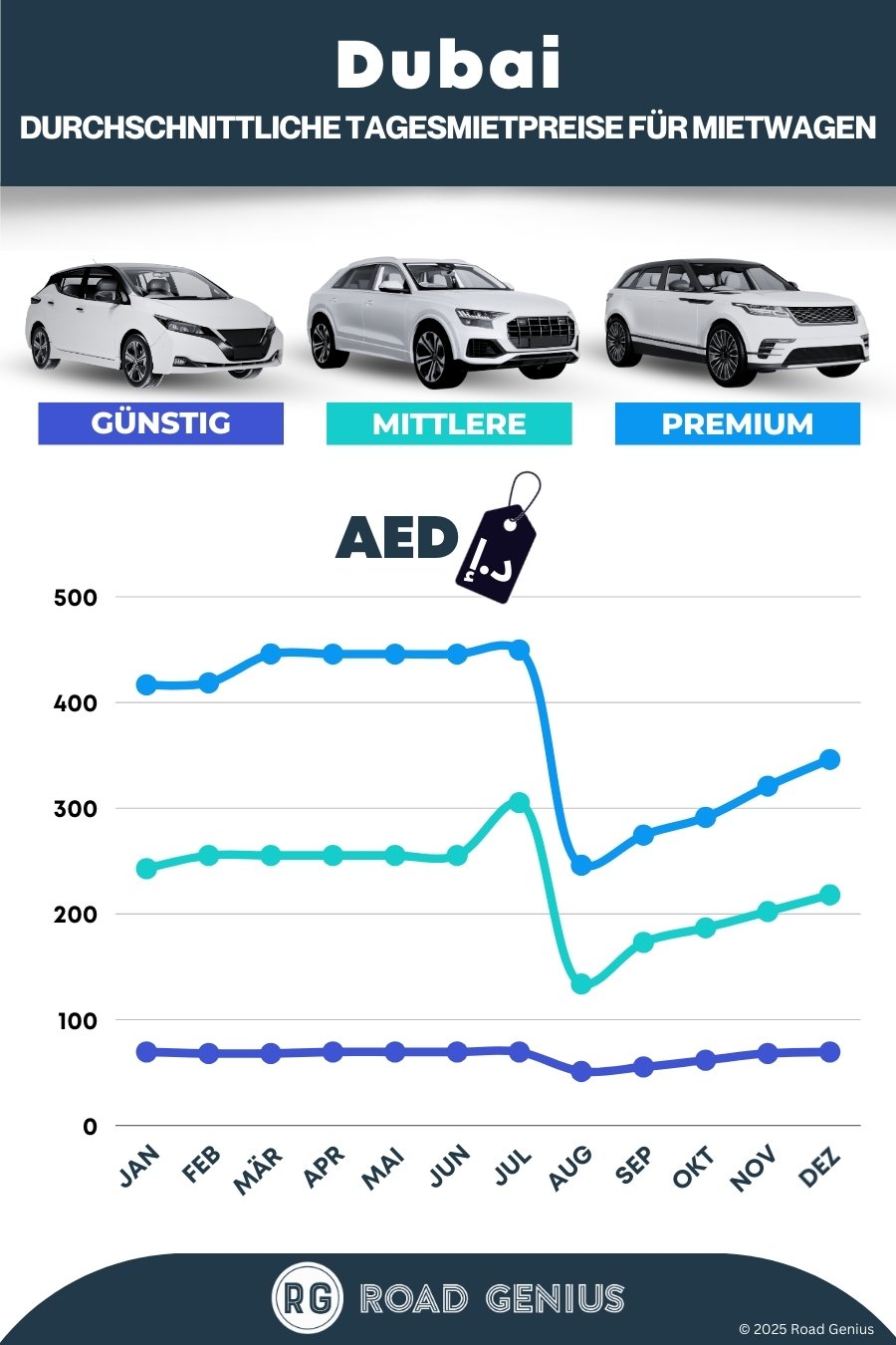 Im Durchschnitt kosten Mietwagen in Dubai etwa 224 AED pro Tag, wobei die günstigsten Angebote bereits ab 51 AED pro Tag verfügbar sind.