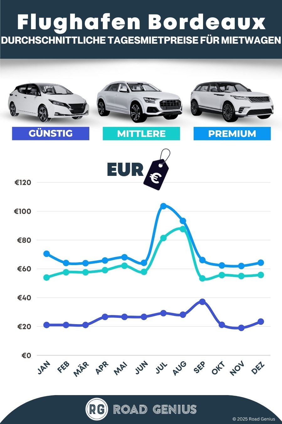 Im Durchschnitt kosten Mietwagen am Flughafen Bordeaux etwa 52 € pro Tag, wobei die günstigsten Angebote bereits ab 19 € pro Tag verfügbar sind.