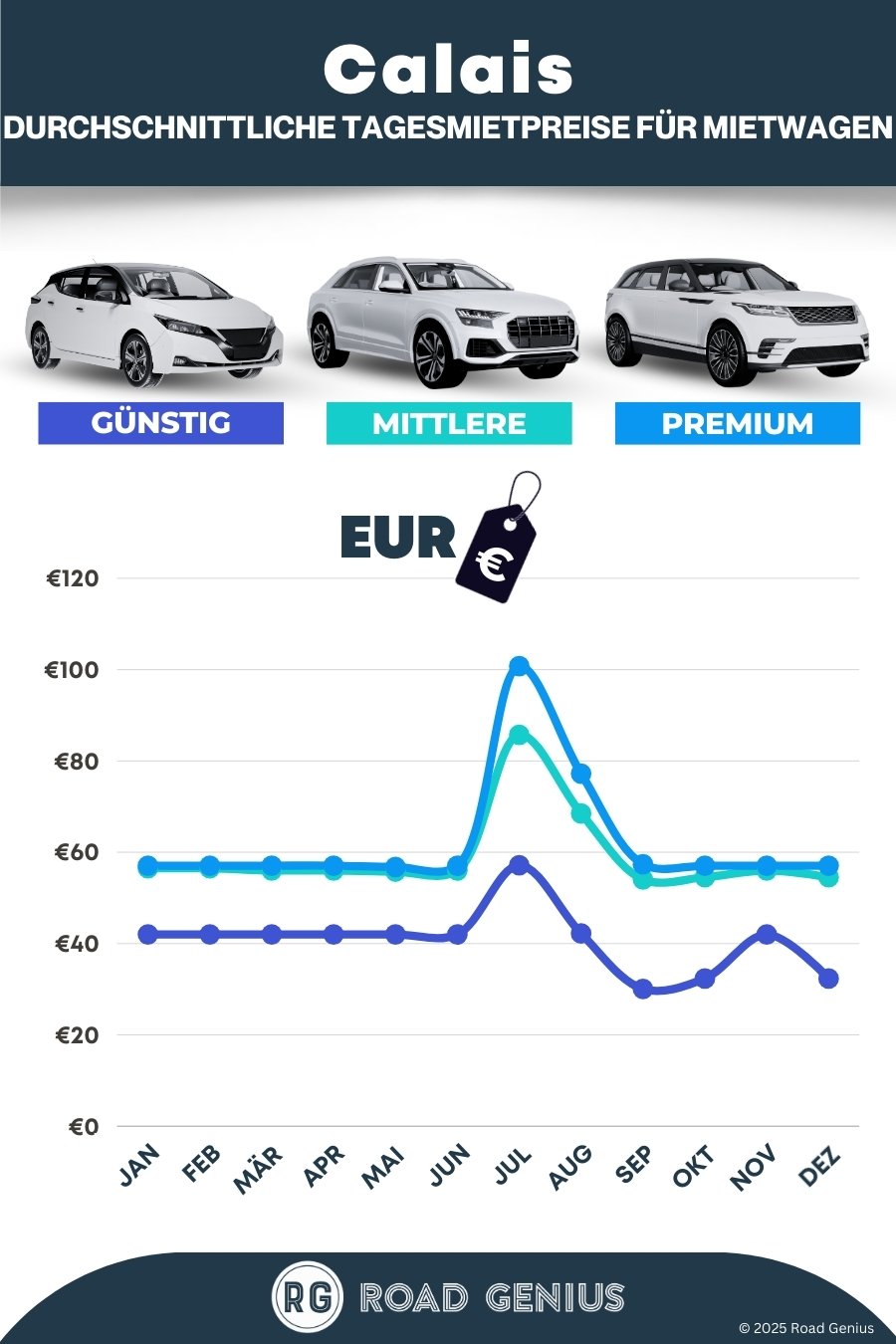 Im Durchschnitt kosten Mietwagen in Calais etwa 54 € pro Tag, wobei die günstigsten Angebote bereits ab 30 € pro Tag verfügbar sind.