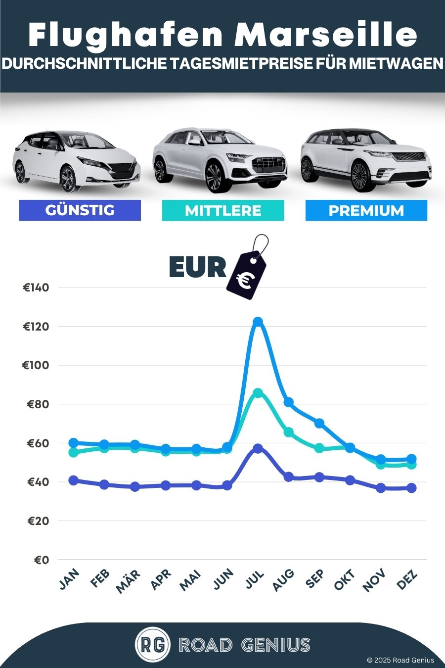 Im Durchschnitt kosten Mietwagen am Flughafen Marseille etwa 55 € pro Tag, wobei die günstigsten Angebote bereits ab 37 € pro Tag verfügbar sind.