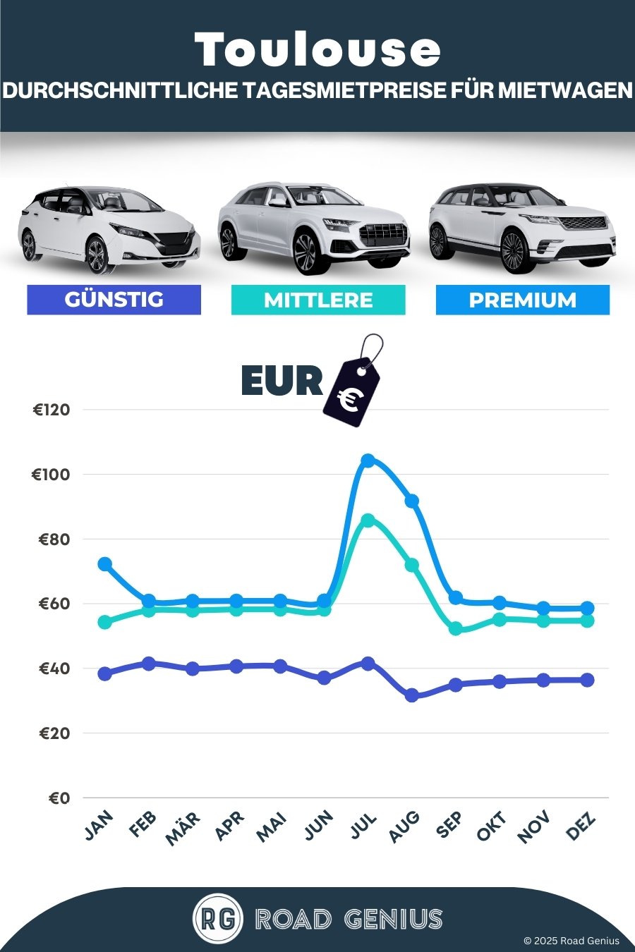 Im Durchschnitt kosten Mietwagen in Toulouse etwa 55 € pro Tag, wobei die günstigsten Angebote bereits ab 32 € pro Tag verfügbar sind.