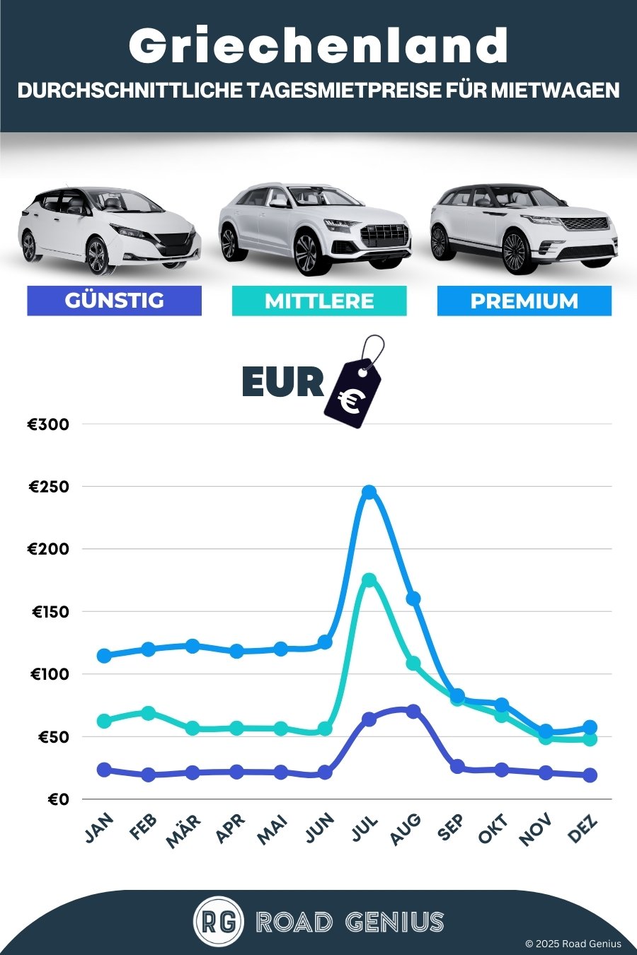 Im Durchschnitt kosten Mietwagen in Griechenland etwa 73 € pro Tag, wobei die günstigsten Angebote bereits ab 19 € pro Tag verfügbar sind.