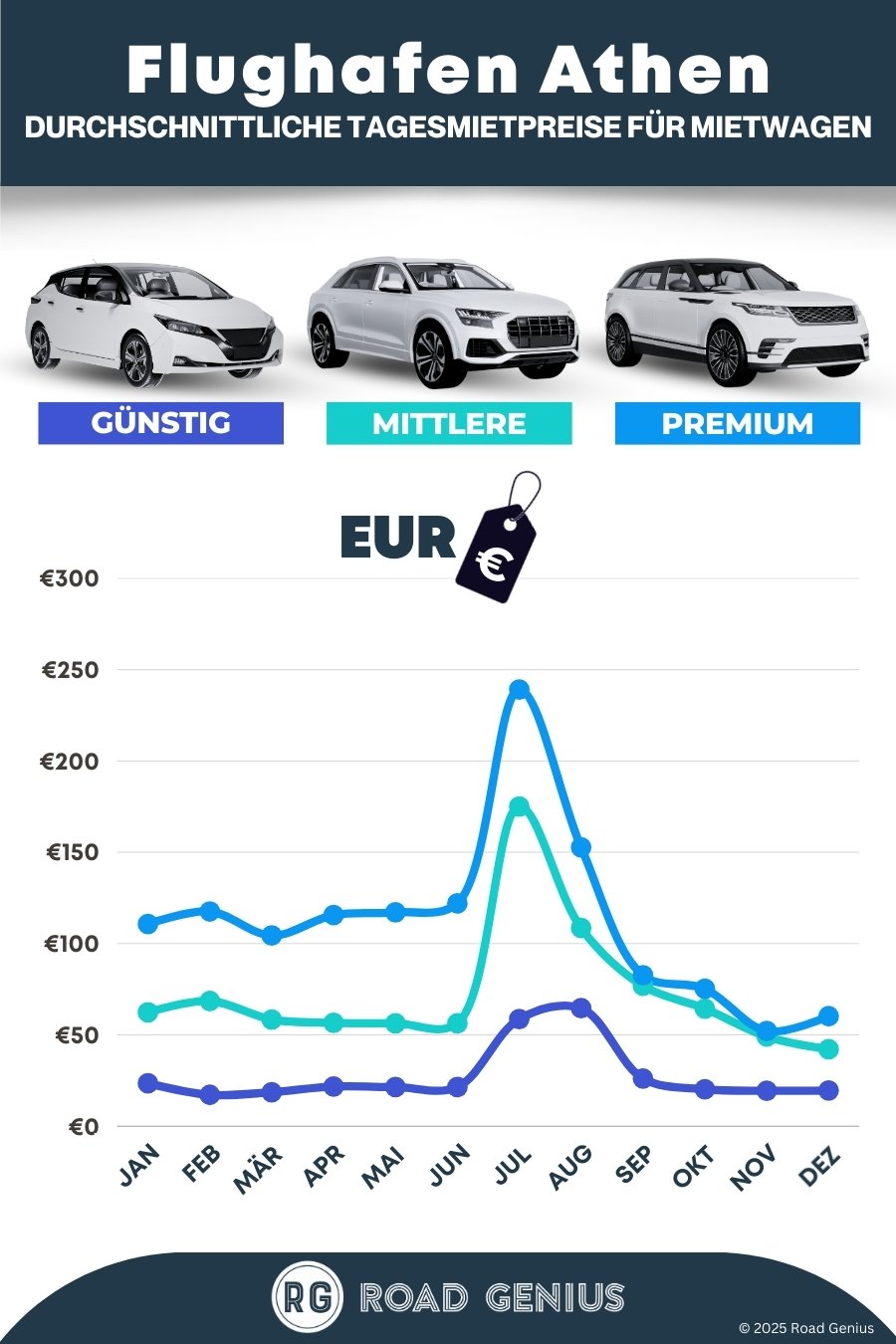Im Durchschnitt kosten Mietwagen am Flughafen Athen etwa 71 € pro Tag, wobei die günstigsten Angebote bereits ab 17 € pro Tag verfügbar sind.
