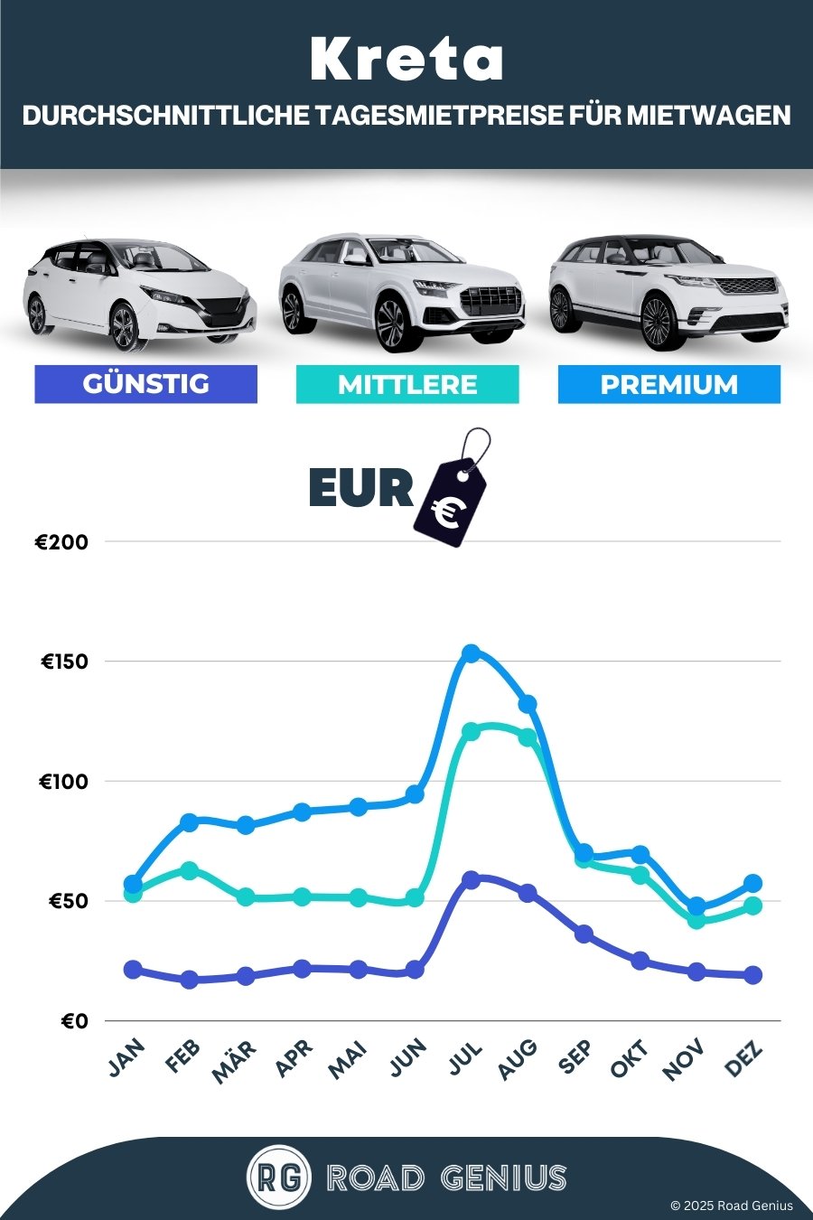 Im Durchschnitt kosten Mietwagen in Kreta etwa 59 € pro Tag, wobei die günstigsten Angebote bereits ab 17 € pro Tag verfügbar sind.