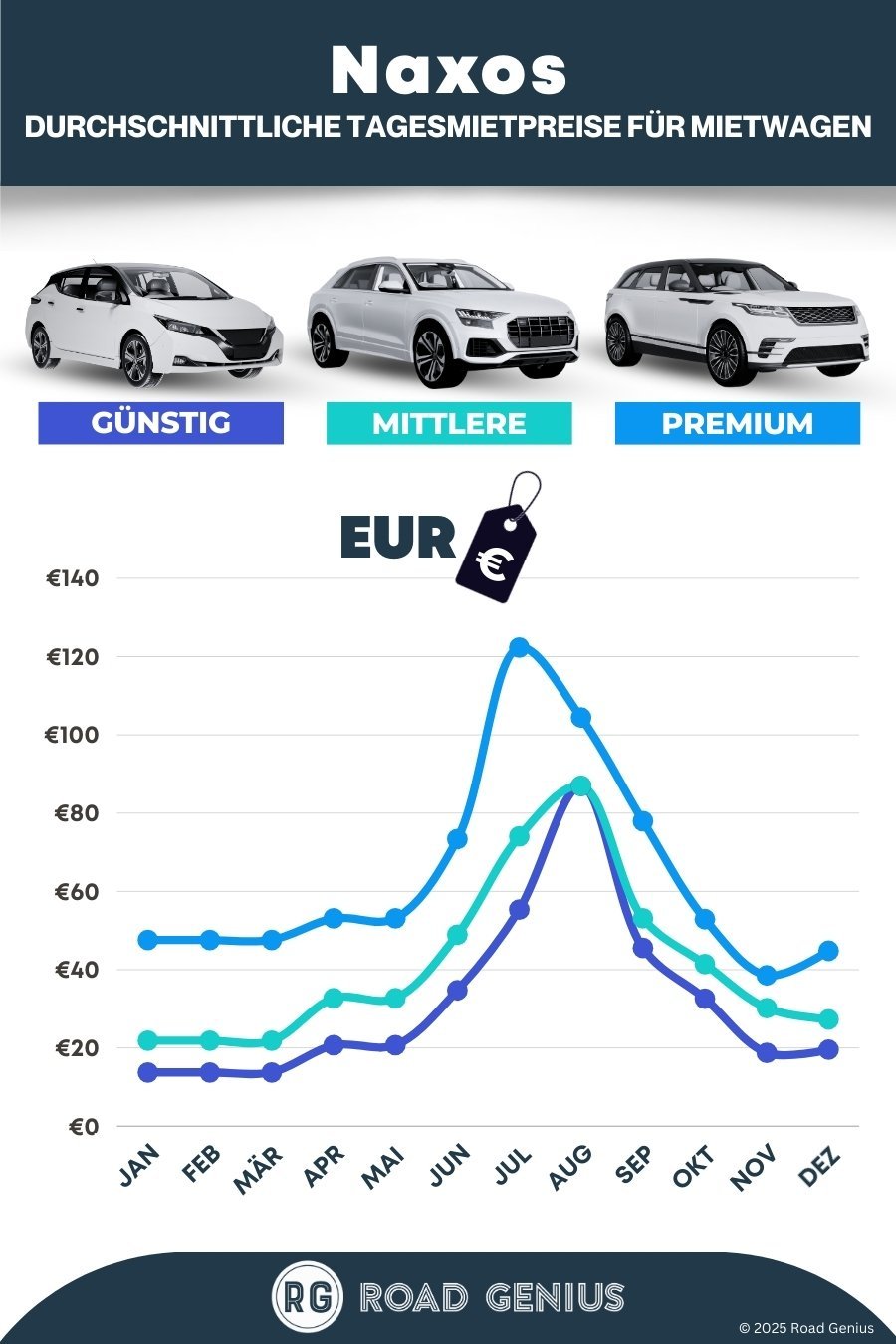 Im Durchschnitt kosten Mietwagen in Naxos etwa 45 € pro Tag, wobei die günstigsten Angebote bereits ab 14 € pro Tag verfügbar sind.