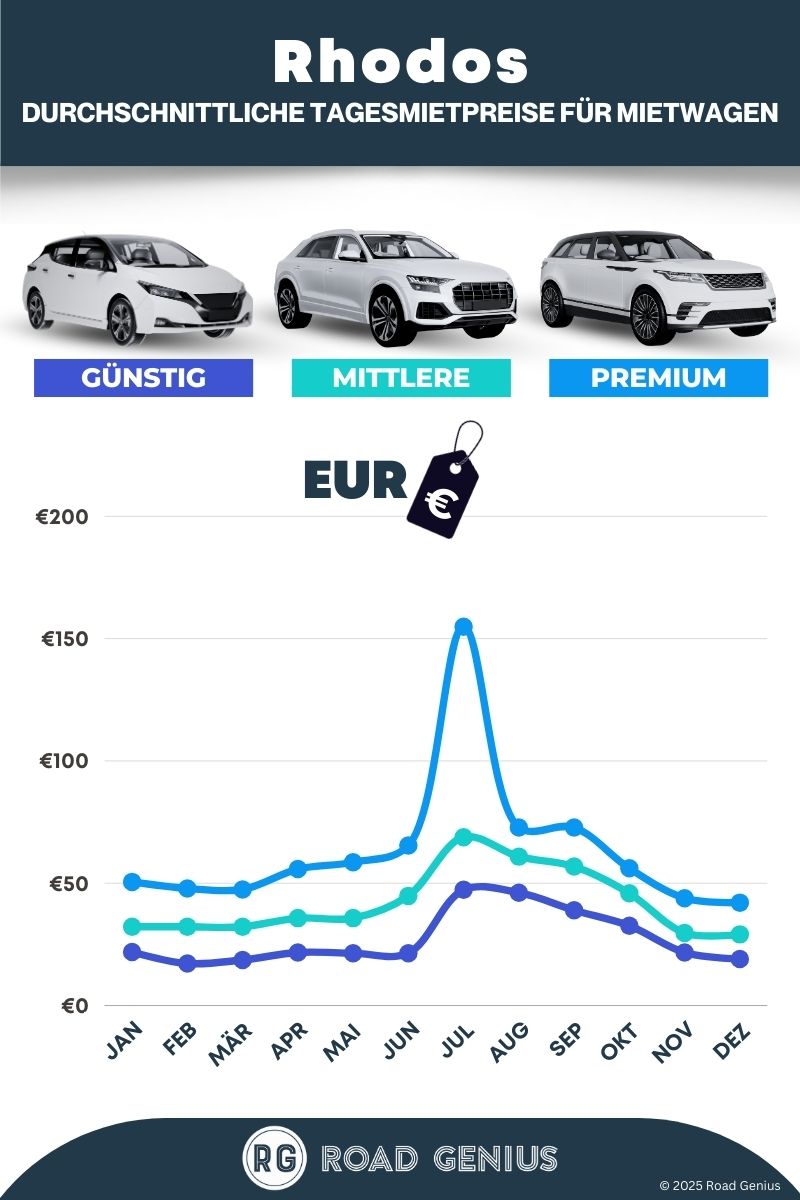 Im Durchschnitt kosten Mietwagen in Rhodos etwa 44 € pro Tag, wobei die günstigsten Angebote bereits ab 17 € pro Tag verfügbar sind.