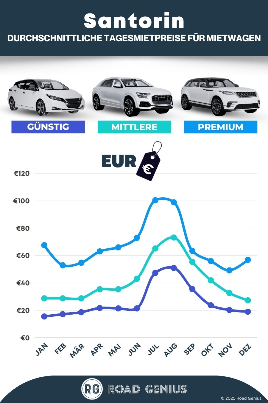 Im Durchschnitt kosten Mietwagen in Santorini etwa 45 € pro Tag, wobei die günstigsten Angebote bereits ab 15 € pro Tag verfügbar sind.