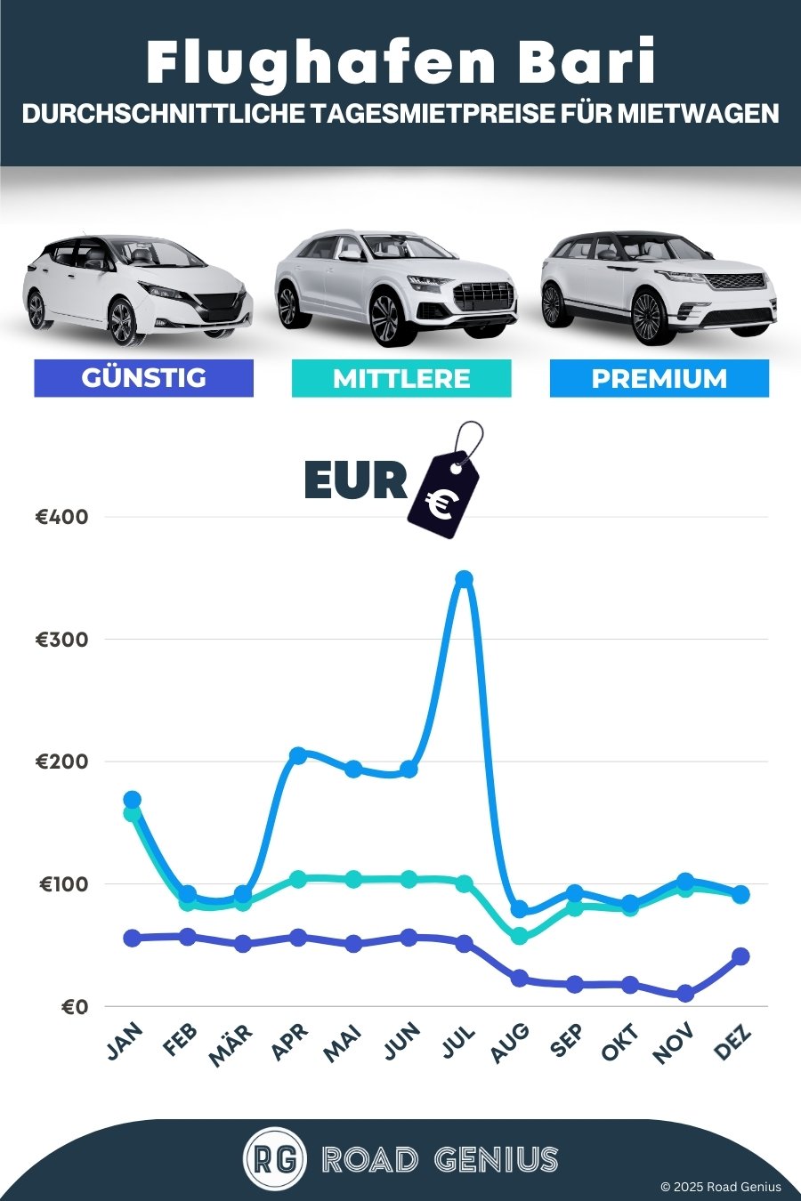 Im Durchschnitt kosten Mietwagen am Flughafen Bari etwa 94 € pro Tag, wobei die günstigsten Angebote bereits ab 11 € pro Tag verfügbar sind.