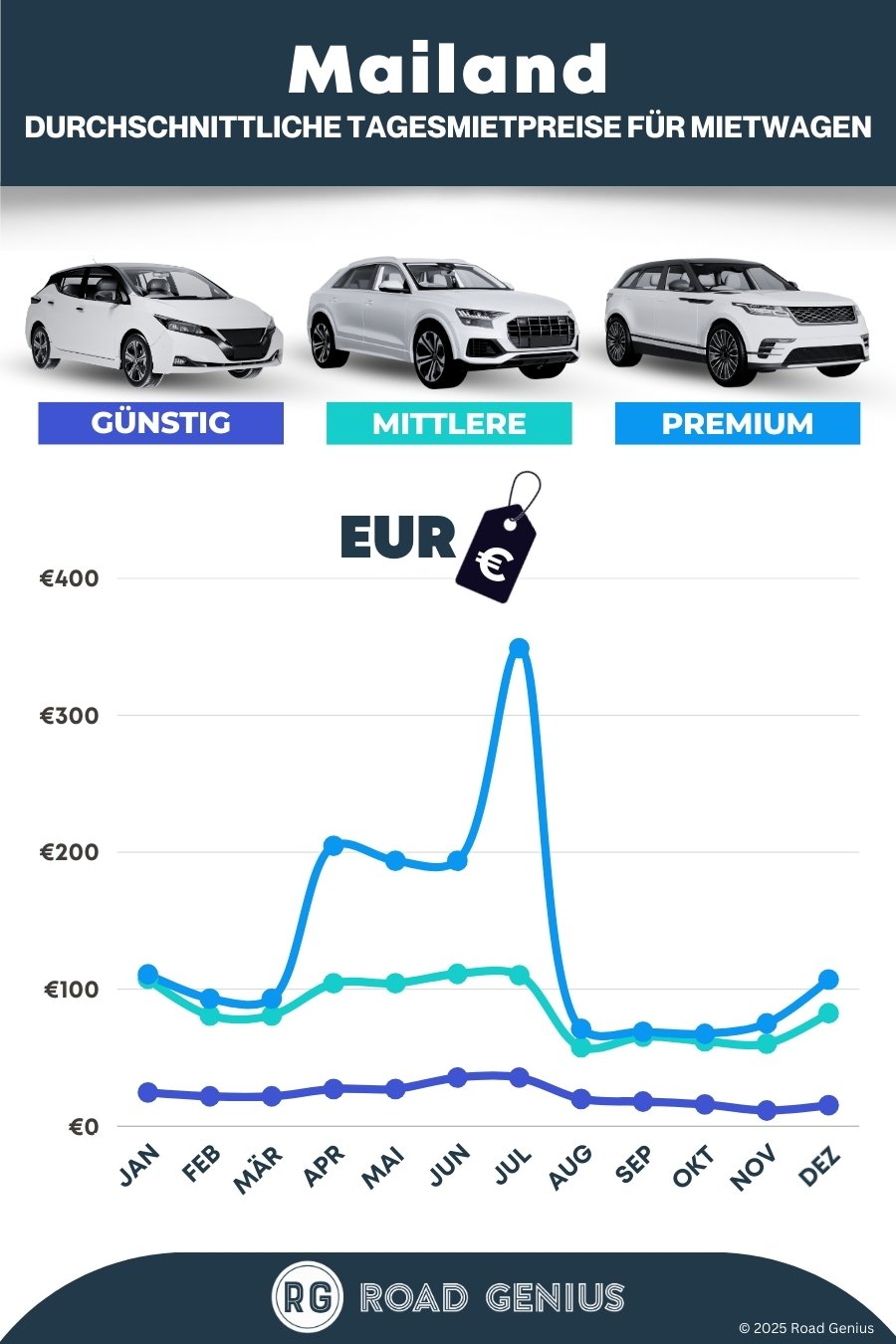 Im Durchschnitt kosten Mietwagen in Mailand etwa 81 € pro Tag, wobei die günstigsten Angebote bereits ab 11 € pro Tag verfügbar sind.