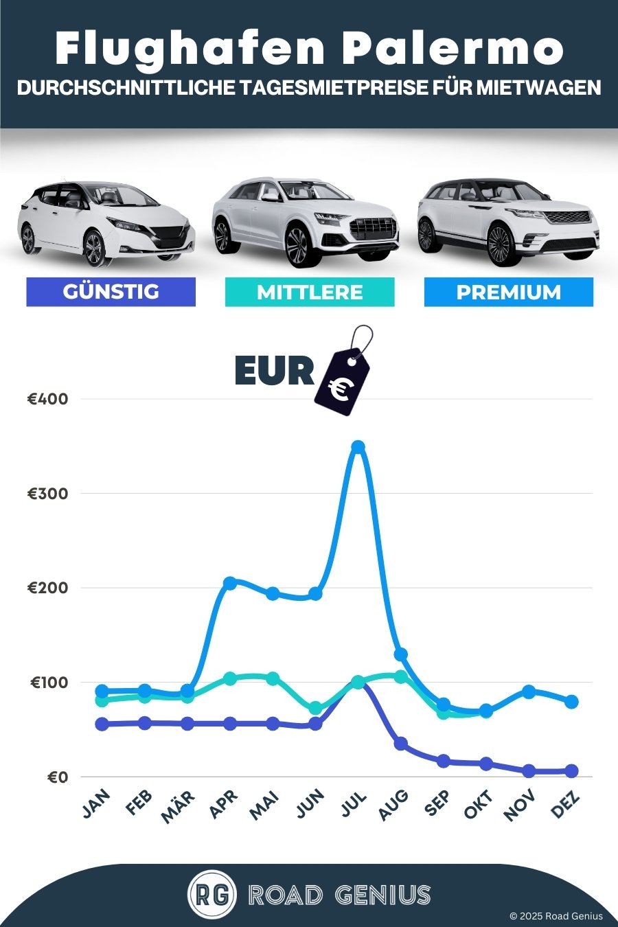 Im Durchschnitt kosten Mietwagen am Flughafen Palermo etwa 89 € pro Tag, wobei die günstigsten Angebote bereits ab 6 € pro Tag verfügbar sind.