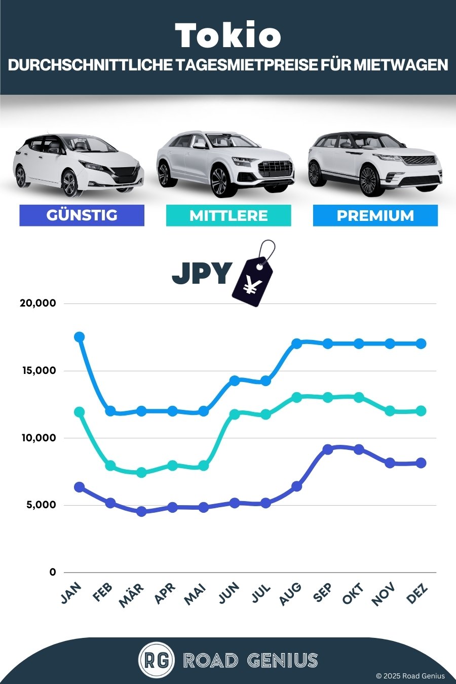 Im Durchschnitt kosten Mietwagen in Tokio etwa 10 734 ¥ pro Tag, wobei die günstigsten Angebote bereits ab 4 546 ¥ pro Tag verfügbar sind.