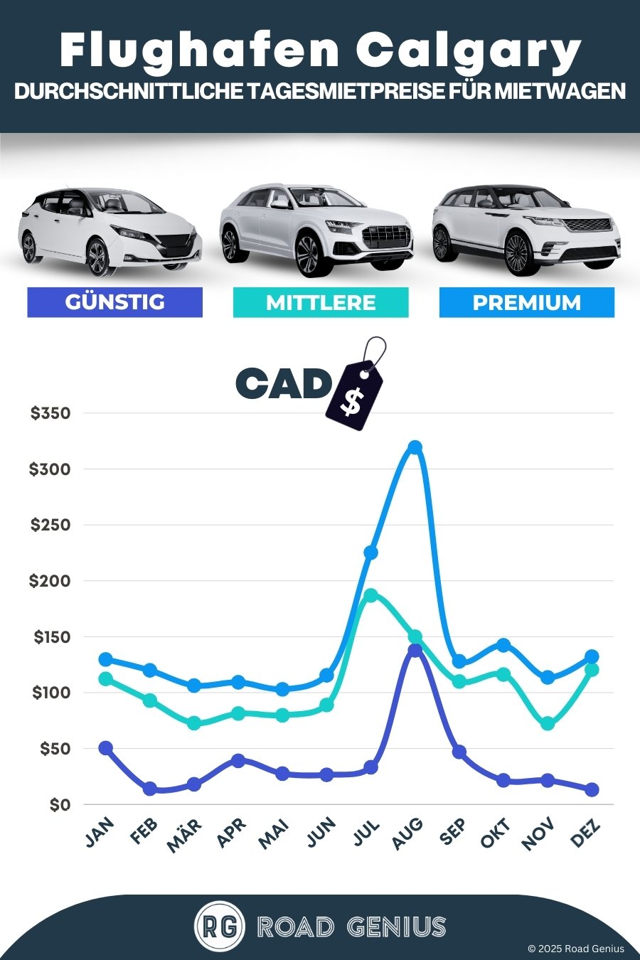 Im Durchschnitt kosten Mietwagen am Flughafen Calgary etwa 97 CAD pro Tag, wobei die günstigsten Angebote bereits ab 13 CAD pro Tag verfügbar sind.