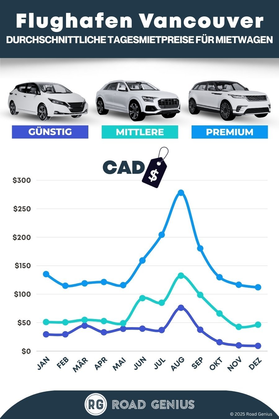 Im Durchschnitt kosten Mietwagen am Flughafen Vancouver etwa 84 CAD pro Tag, wobei die günstigsten Angebote bereits ab 9 CAD pro Tag verfügbar sind.
