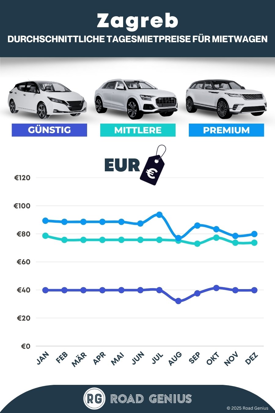 Im Durchschnitt kosten Mietwagen in Zagreb etwa 67 € pro Tag, wobei die günstigsten Angebote bereits ab 32 € pro Tag verfügbar sind.