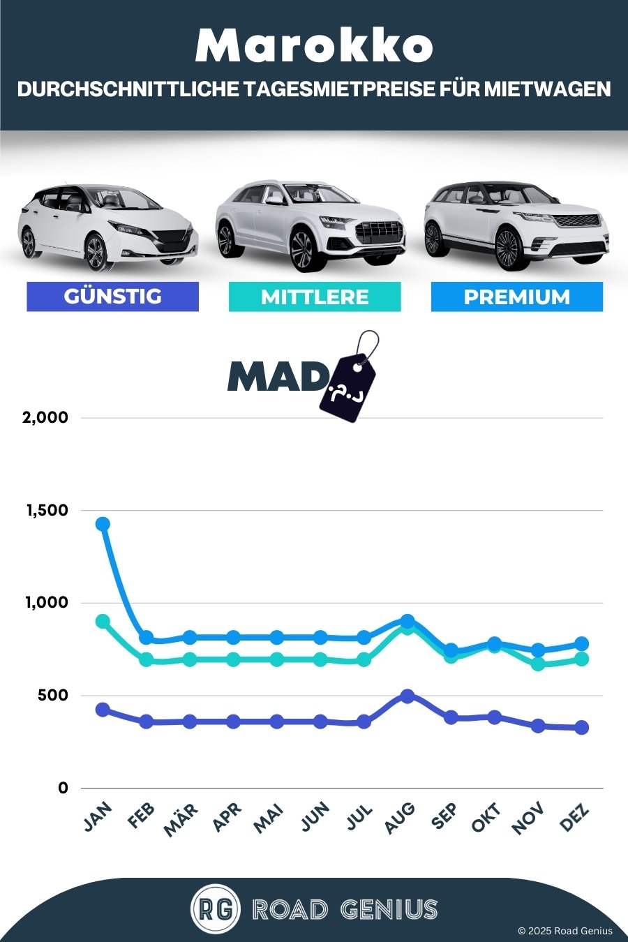 Im Durchschnitt kosten Mietwagen in Marokko etwa 654 MAD pro Tag, wobei die günstigsten Angebote bereits ab 328 MAD pro Tag verfügbar sind.