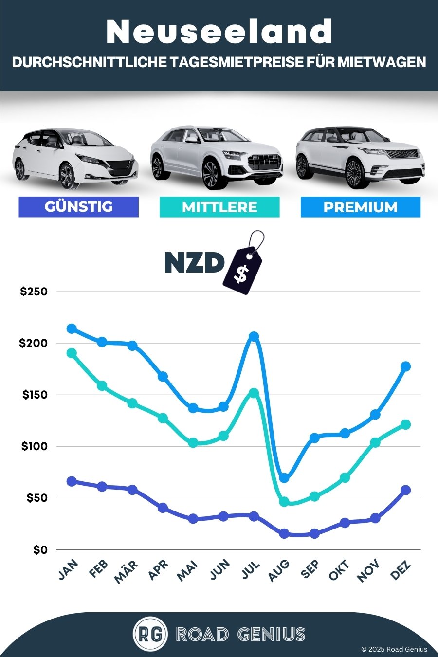 Im Durchschnitt kosten Mietwagen in Neuseeland etwa 103 NZD pro Tag, wobei die günstigsten Angebote bereits ab 16 NZD pro Tag verfügbar sind.