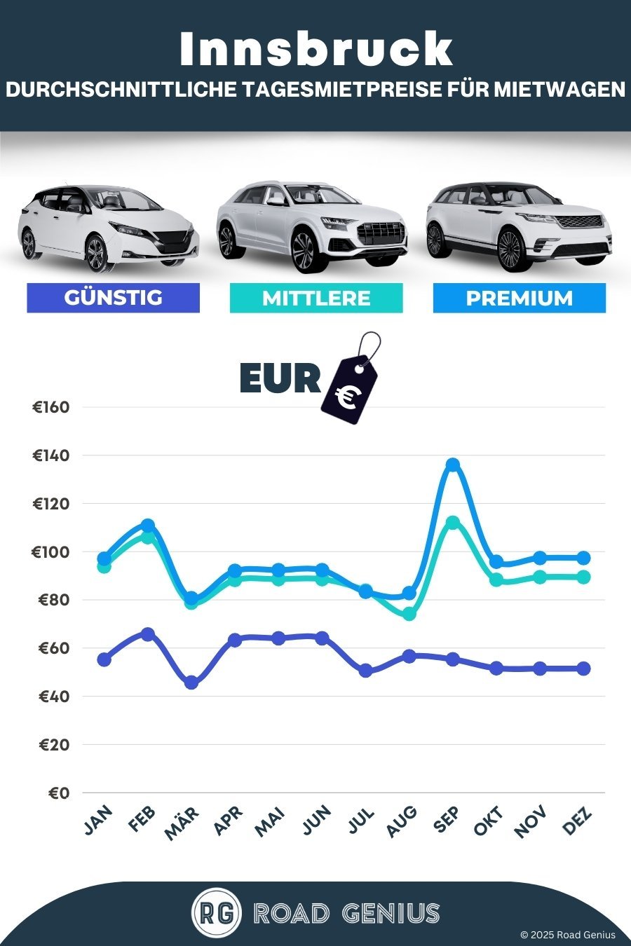 Im Durchschnitt kosten Mietwagen in Innsbruck etwa 81 € pro Tag, wobei die günstigsten Angebote bereits ab 46 € pro Tag verfügbar sind.