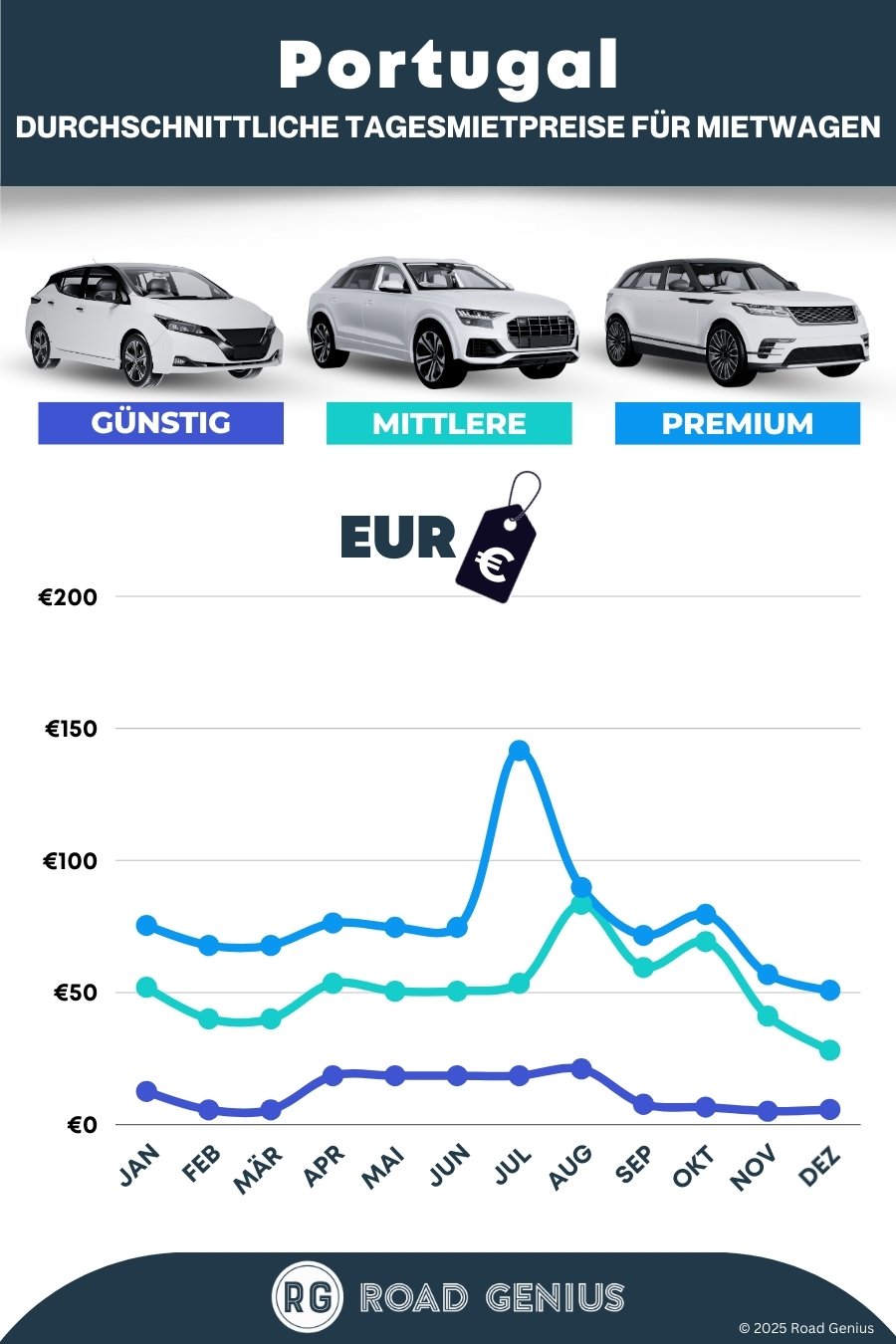 Im Durchschnitt kosten Mietwagen in Portugal etwa 47 € pro Tag, wobei die günstigsten Angebote bereits ab 5 € pro Tag verfügbar sind.