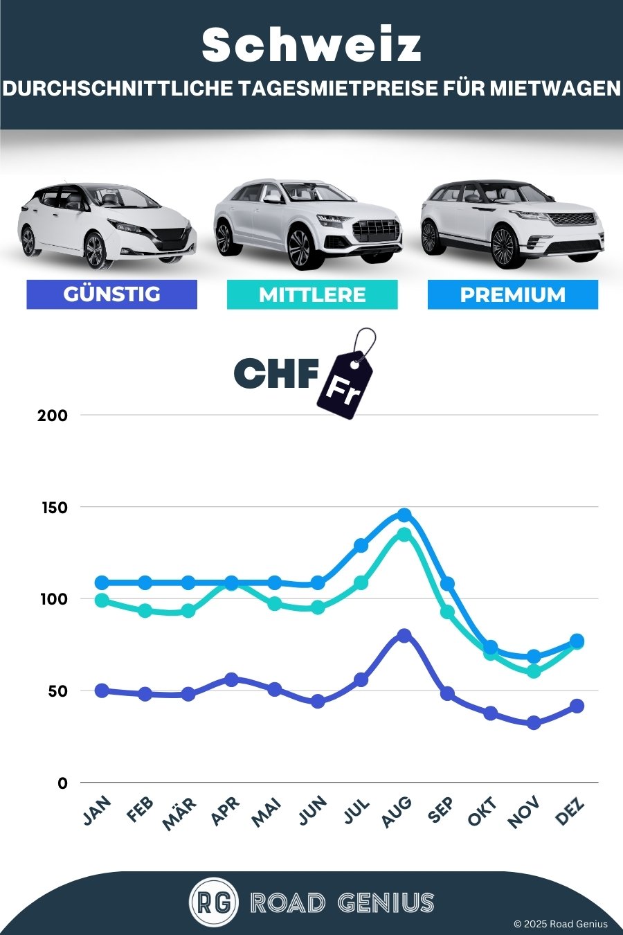 Im Durchschnitt kosten Mietwagen in Schweiz etwa 83 CHF pro Tag, wobei die günstigsten Angebote bereits ab 32 CHF pro Tag verfügbar sind.