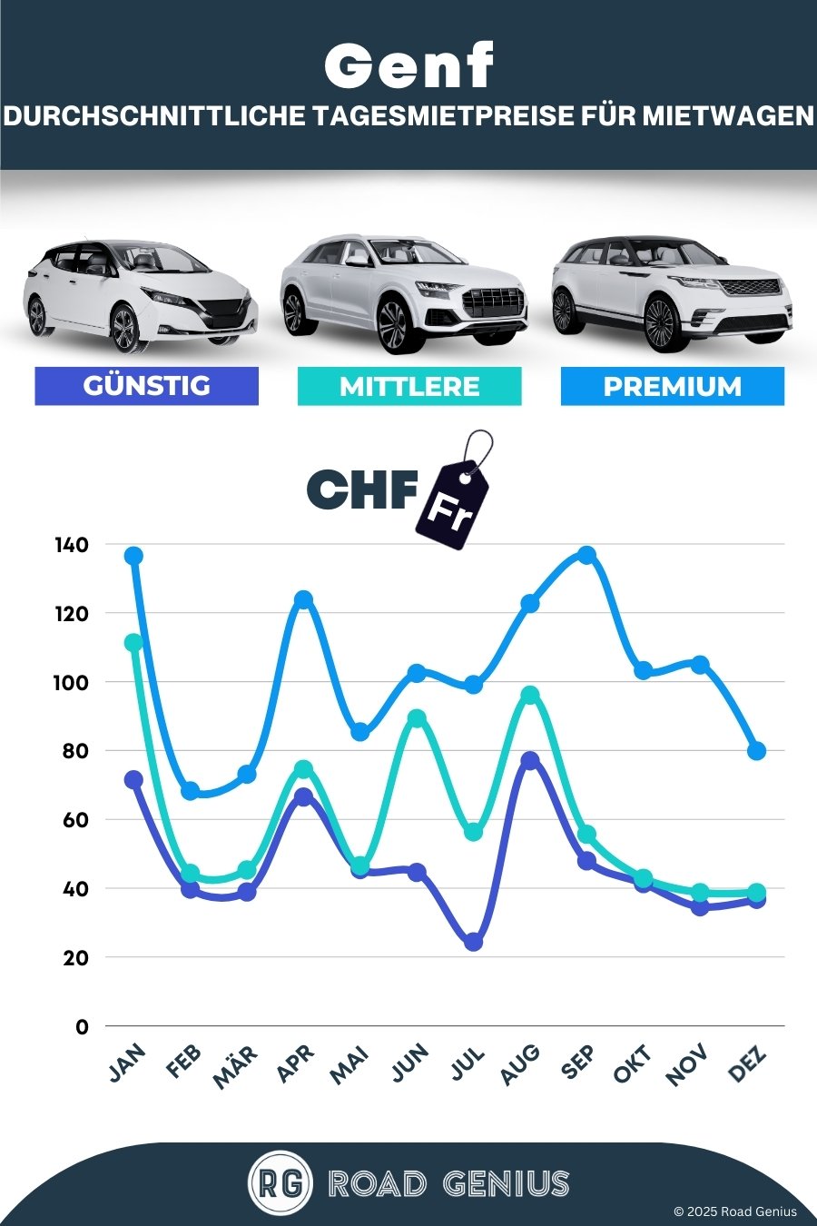 Im Durchschnitt kosten Mietwagen in Genf etwa 71 CHF pro Tag, wobei die günstigsten Angebote bereits ab 24 CHF pro Tag verfügbar sind.