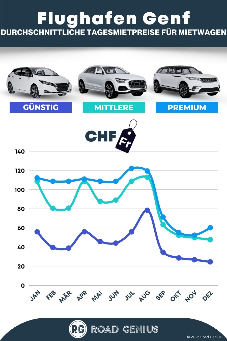 Im Durchschnitt kosten Mietwagen am Flughafen Genf etwa 74 CHF pro Tag, wobei die günstigsten Angebote bereits ab 25 CHF pro Tag verfügbar sind.