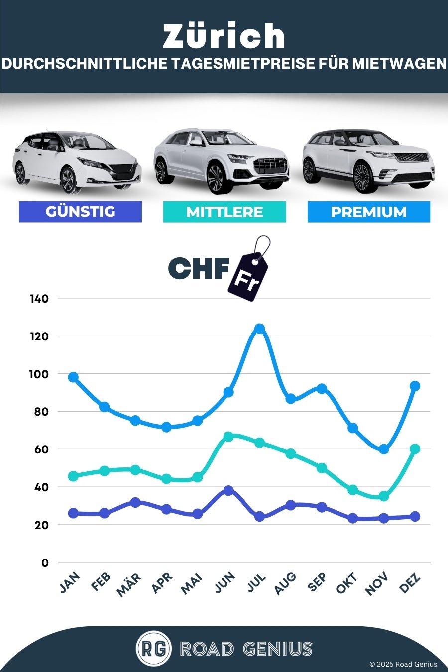 Im Durchschnitt kosten Mietwagen in Zürich etwa 58 CHF pro Tag, wobei die günstigsten Angebote bereits ab 23 CHF pro Tag verfügbar sind.