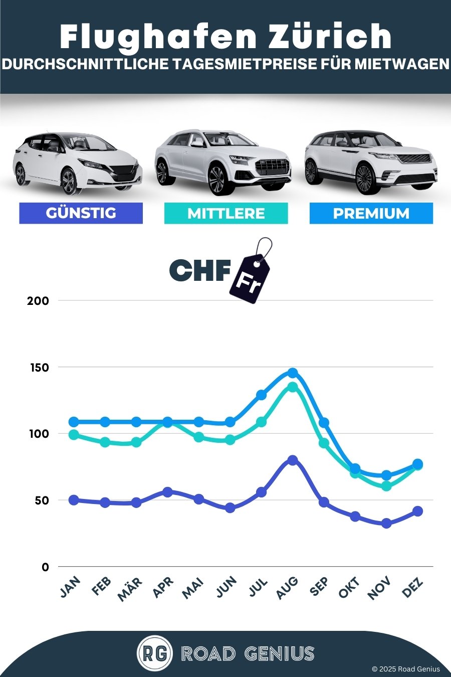 Im Durchschnitt kosten Mietwagen am Flughafen Zürich etwa 76 CHF pro Tag, wobei die günstigsten Angebote bereits ab 25 CHF pro Tag verfügbar sind.