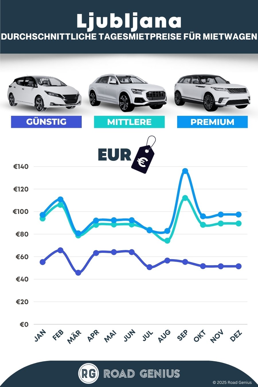 Im Durchschnitt kosten Mietwagen in Ljubljana etwa 81 € pro Tag, wobei die günstigsten Angebote bereits ab 46 € pro Tag verfügbar sind.