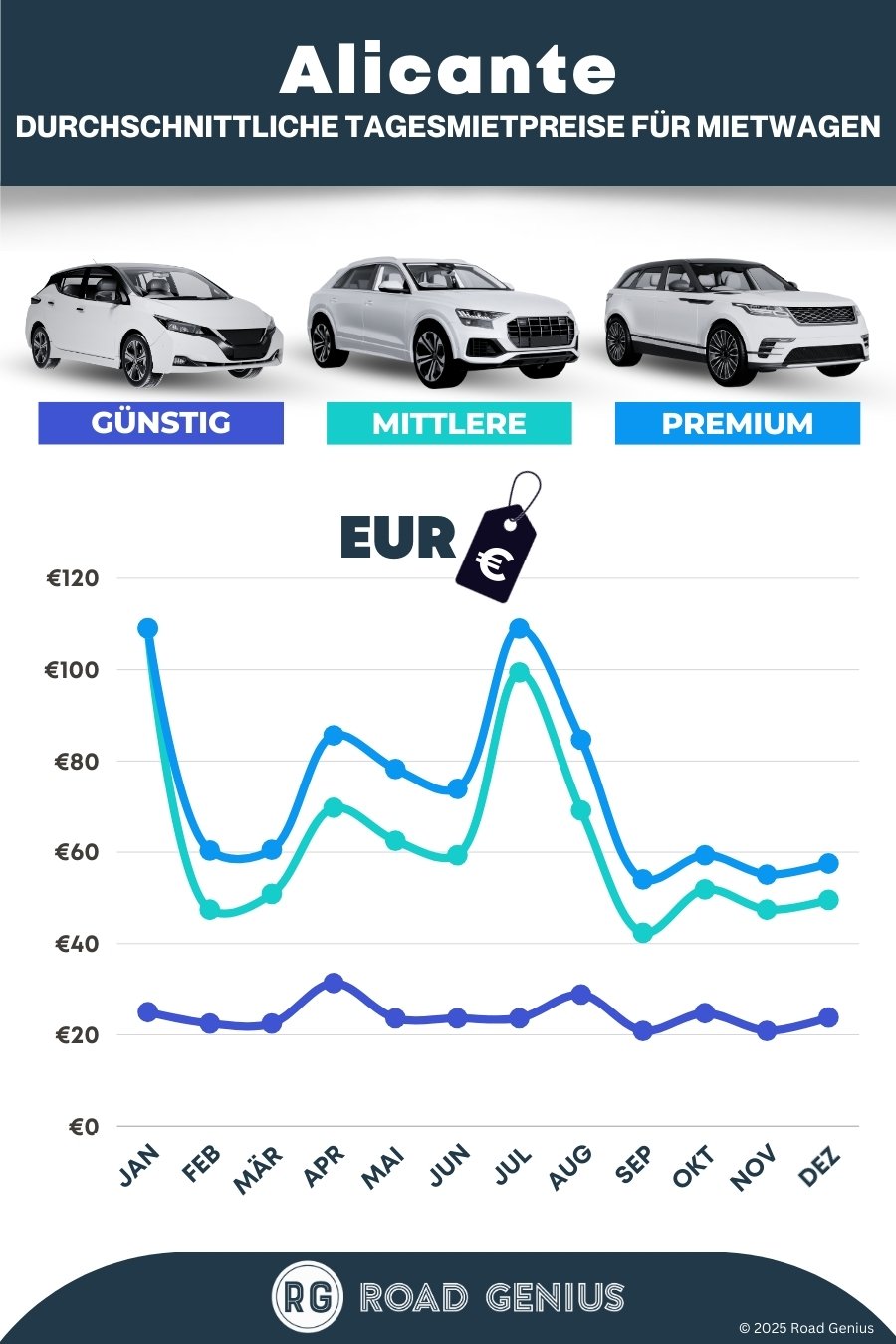 Im Durchschnitt kosten Mietwagen in Alicante etwa 54 € pro Tag, wobei die günstigsten Angebote bereits ab 21 € pro Tag verfügbar sind.