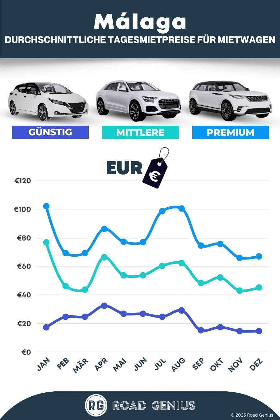 Im Durchschnitt kosten Mietwagen in Málaga etwa 52 € pro Tag, wobei die günstigsten Angebote bereits ab 15 € pro Tag verfügbar sind.