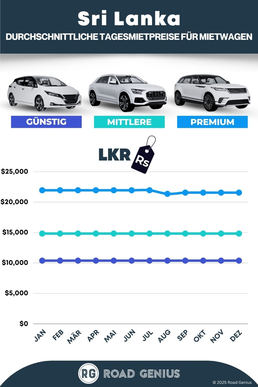 Im Durchschnitt kosten Mietwagen in Sri Lanka etwa 15.663 LKR pro Tag, wobei die günstigsten Angebote bereits ab 10.383 LKR pro Tag verfügbar sind.