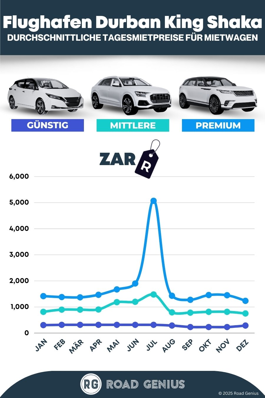 Im Durchschnitt kosten Mietwagen am King Shaka International Airport Durban etwa 997 ZAR pro Tag, wobei die günstigsten Angebote bereits ab 230 ZAR pro Tag verfügbar sind.