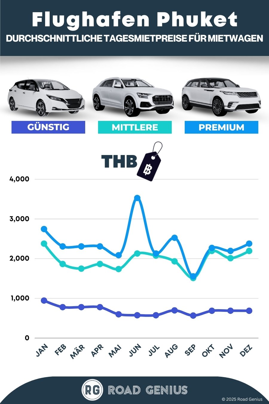 Im Durchschnitt kosten Mietwagen am Flughafen Phuket etwa 1.676 THB pro Tag, wobei die günstigsten Angebote bereits ab 566 THB pro Tag verfügbar sind.