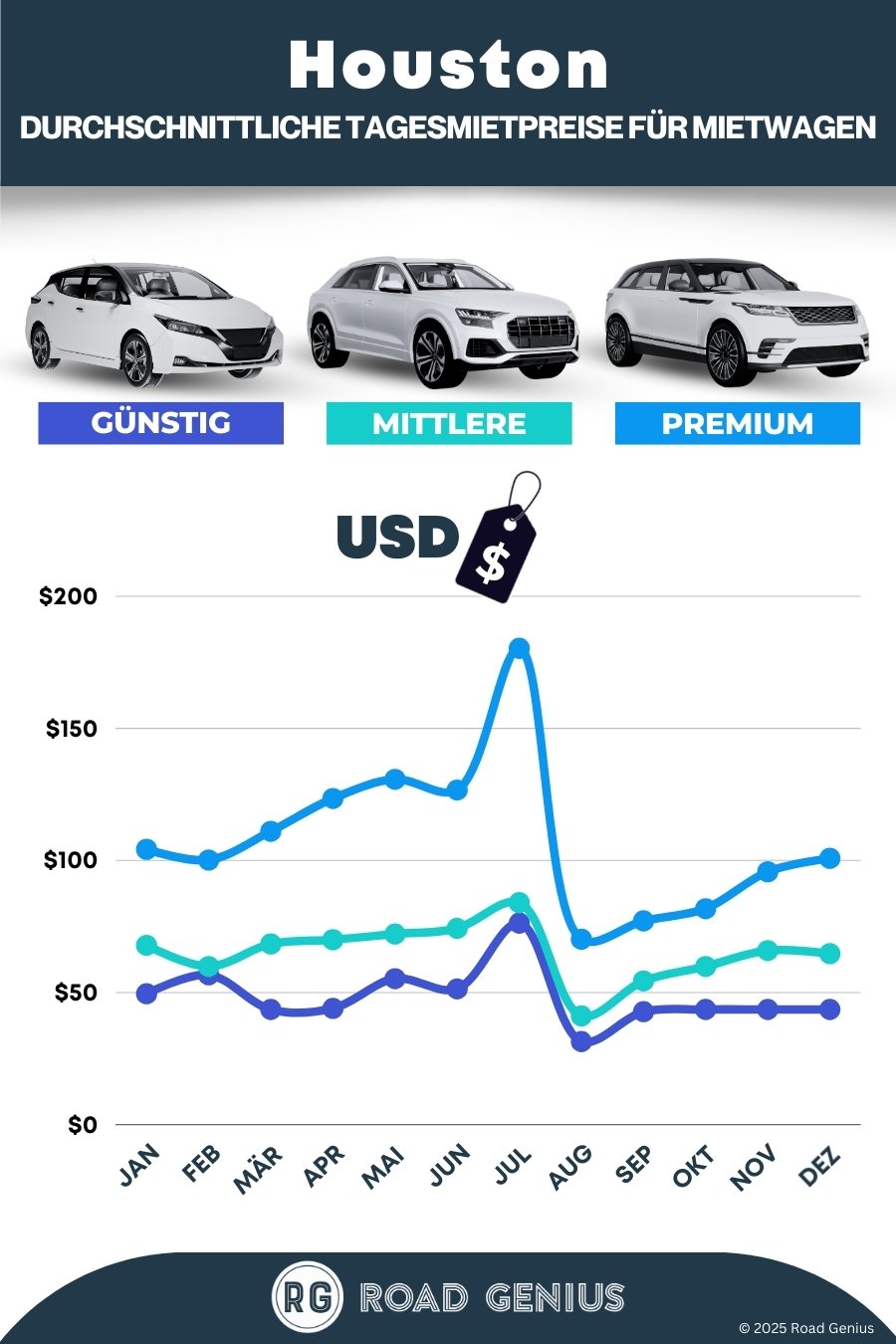 Im Durchschnitt kosten Mietwagen in Houston etwa 74 USD pro Tag, wobei die günstigsten Angebote bereits ab 31 USD pro Tag verfügbar sind.