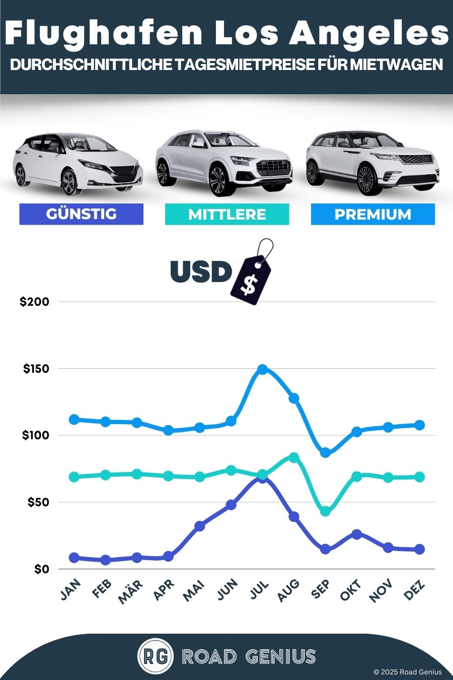 Vergleichen Sie alles auf unserer Seite: Anbieter, Fahrzeugklassen und Abholzeiten. Die Preise am LAX können sich täglich stark ändern, wobei kleinere Fahrzeugklassen meist am günstigsten sind.