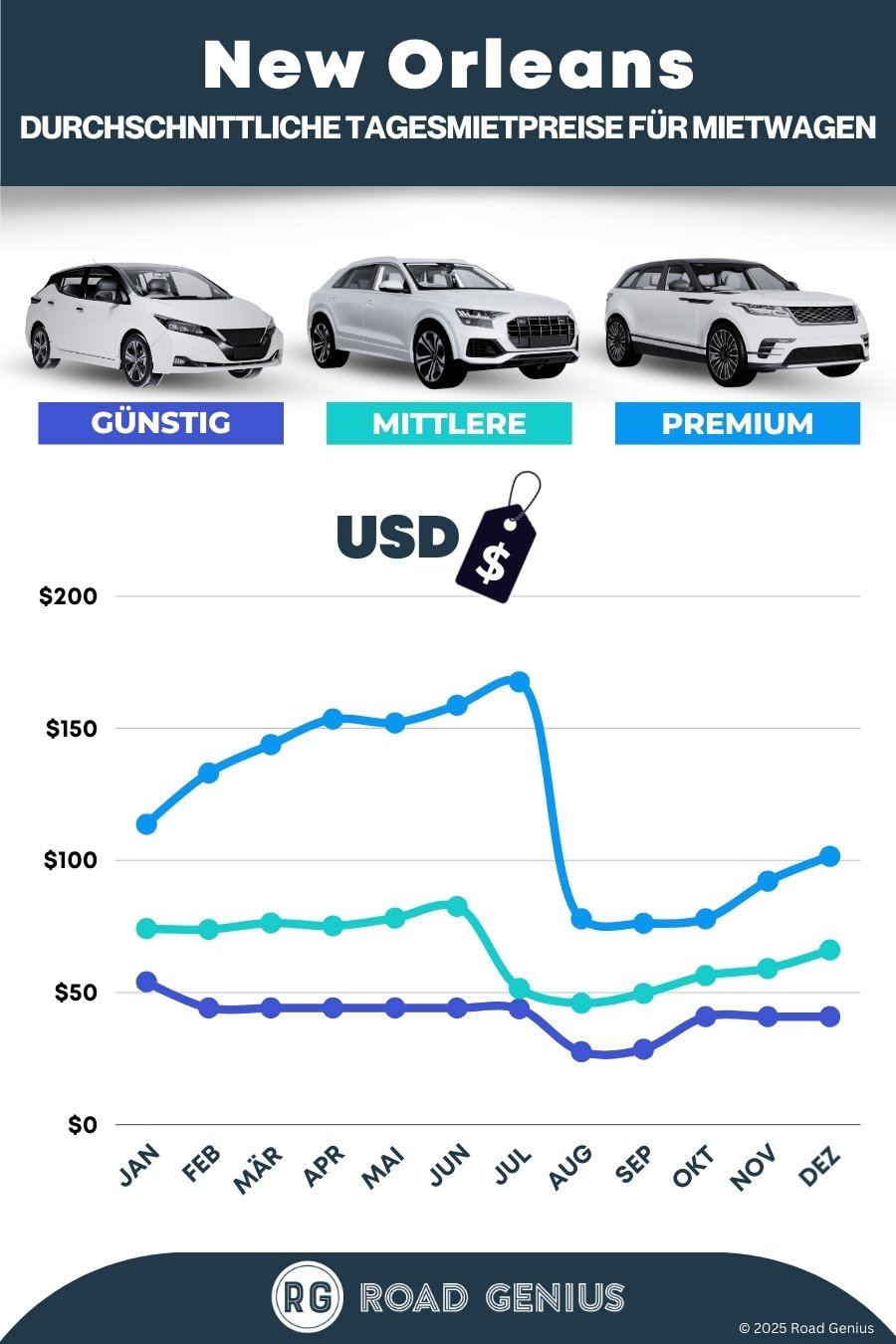 Im Durchschnitt kosten Mietwagen in New Orleans etwa 76 USD pro Tag, wobei die günstigsten Angebote bereits ab 28 USD pro Tag verfügbar sind.