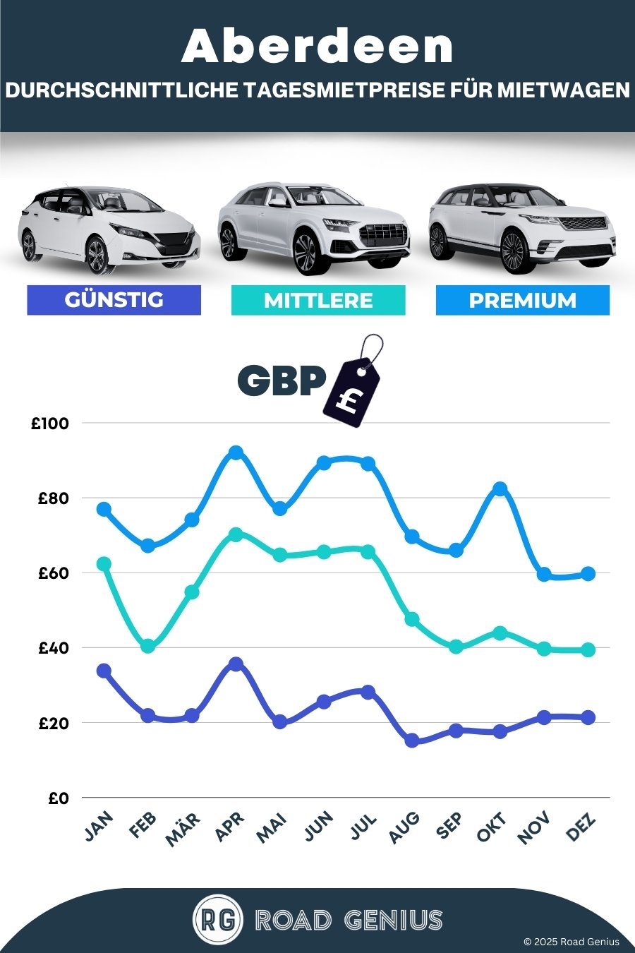 Vergleichen Sie möglichst viele Anbieter: Prüfen Sie die Angebote mehrerer Marken und beziehen Sie auch lokale schottische Vermieter in Ihre Suche ein. Die Preisunterschiede in Aberdeen können überraschend groß sein.