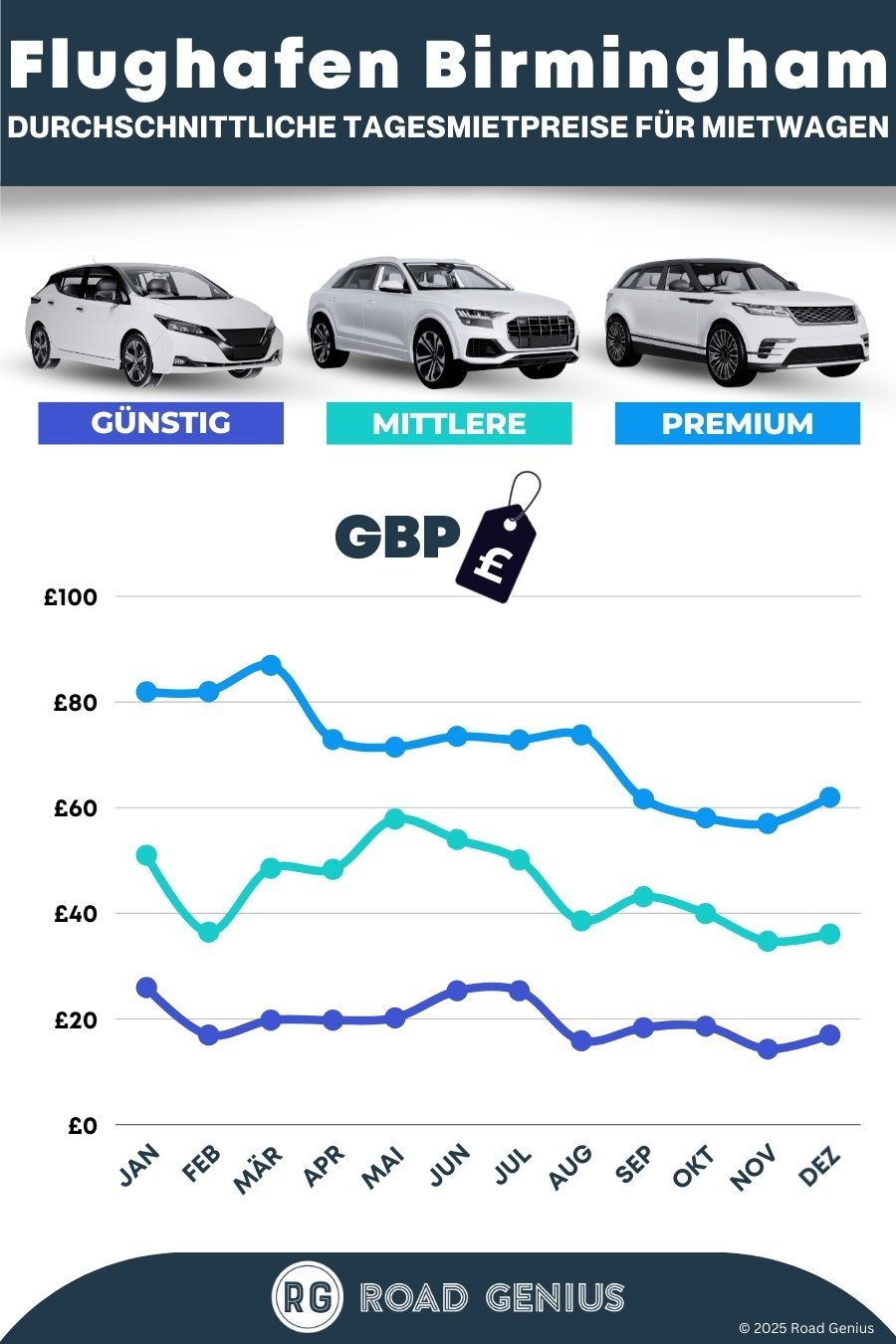Im Durchschnitt kosten Mietwagen am Flughafen Birmingham etwa 45 € pro Tag, wobei die günstigsten Angebote bereits ab 14 € pro Tag verfügbar sind.