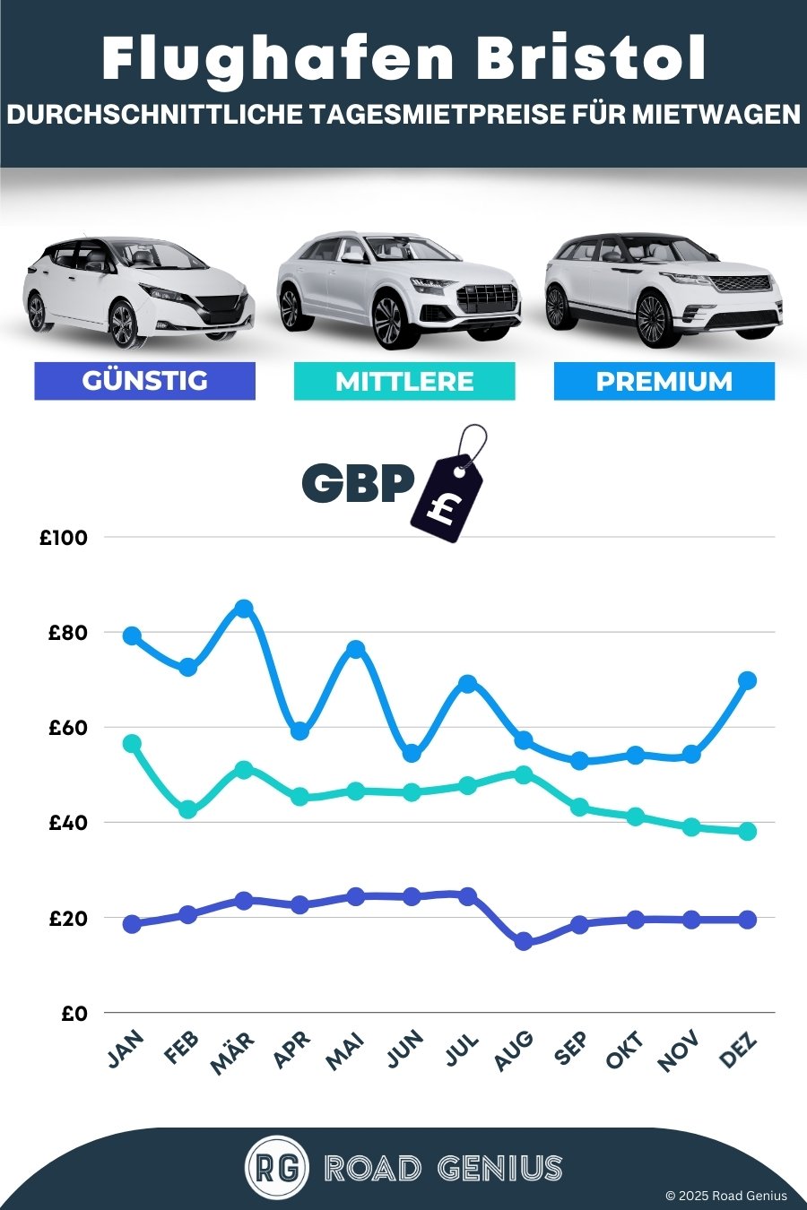 Im Durchschnitt kosten Mietwagen am Flughafen Bristol etwa 44 € pro Tag, wobei die günstigsten Angebote bereits ab 15 € pro Tag verfügbar sind.