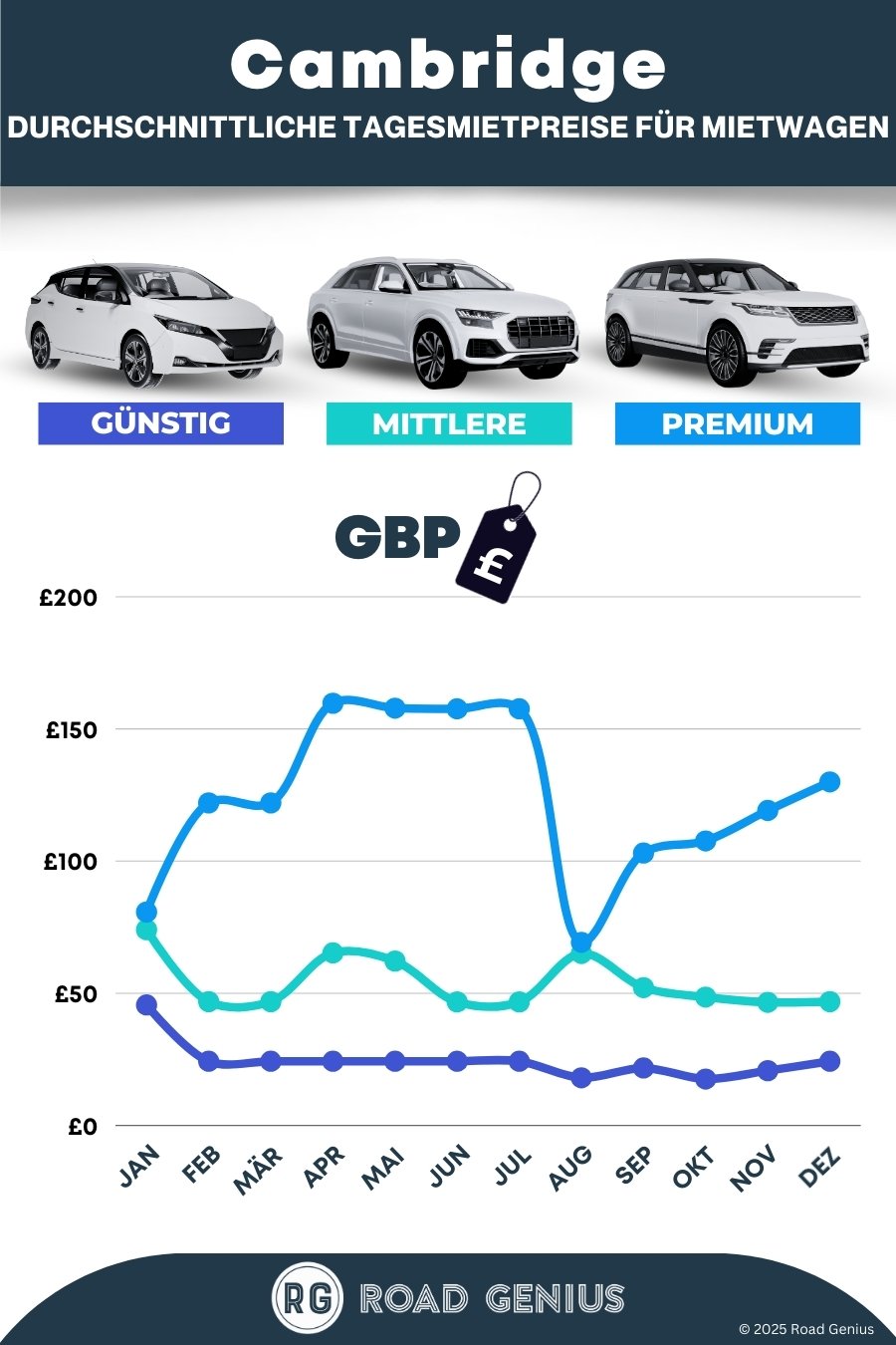 Im Durchschnitt kosten Mietwagen in Cambridge etwa 67 € pro Tag, wobei die günstigsten Angebote bereits ab 18 € pro Tag verfügbar sind.