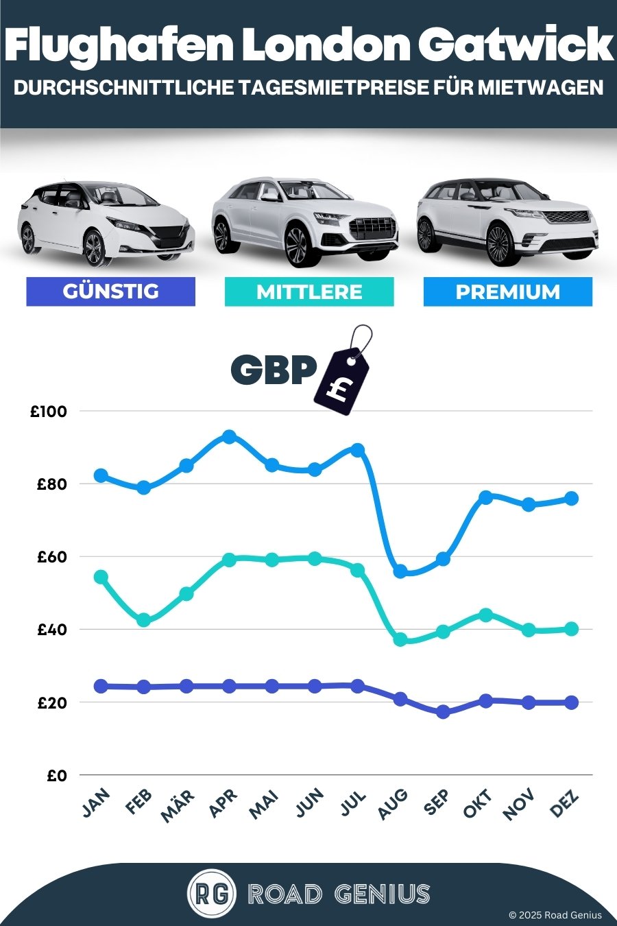 Im Durchschnitt kosten Mietwagen am Flughafen London-Gatwick etwa 50 € pro Tag, wobei die günstigsten Angebote bereits ab 17 € pro Tag verfügbar sind.