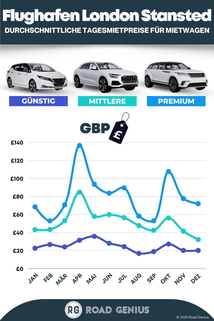 Im Durchschnitt kosten Mietwagen am Flughafen London-Stansted etwa 52 € pro Tag, wobei die günstigsten Angebote bereits ab 17 € pro Tag verfügbar sind.