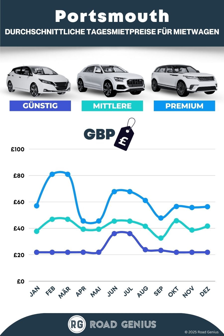 Im Durchschnitt kostet die Anmietung eines Autos in Portsmouth etwa €42 pro Tag, wobei die günstigsten Angebote bereits ab €22 pro Tag verfügbar sind.